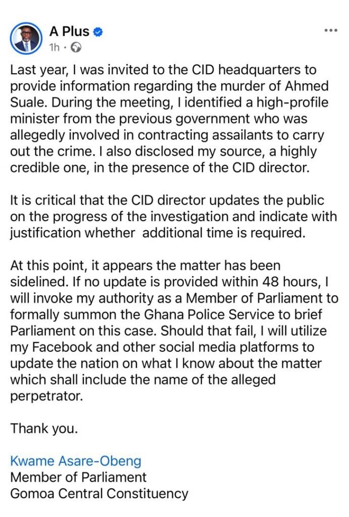 In a bold statement posted on Facebook, Kwame Asare-Obeng, also known as Kwame A Plus, has given the Ghana Police a 48-hour ultimatum to provide an update on the investigation into the murder of investigative journalist Ahmed Suale or face his wrath in Parliament. The Member of Parliament for Gomoa Central Constituency is demanding transparency and accountability regarding the investigation into Suale’s killing, which has remained a topic of national concern since it occurred.