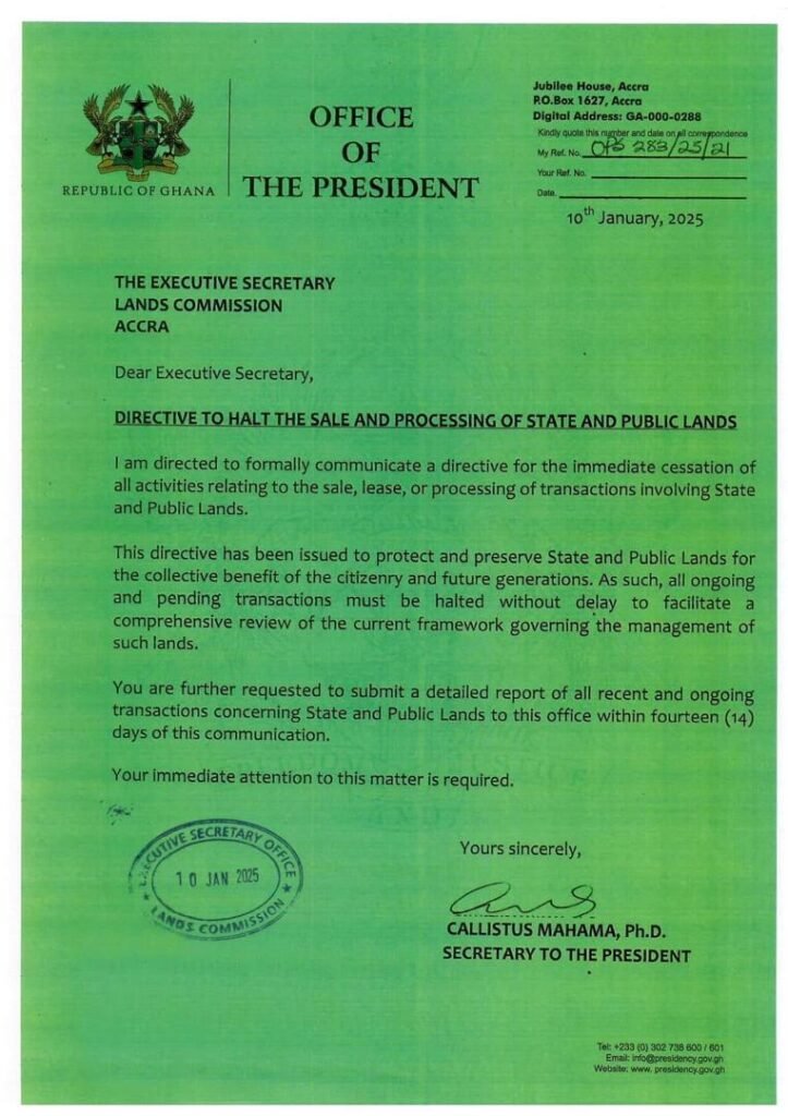 In a significant move aimed at ensuring transparency, accountability, and sustainable management of Ghana’s resources, the Office of the President has directed the Lands Commission to immediately cease all activities relating to the sale, lease, or processing of transactions involving State and Public Lands.