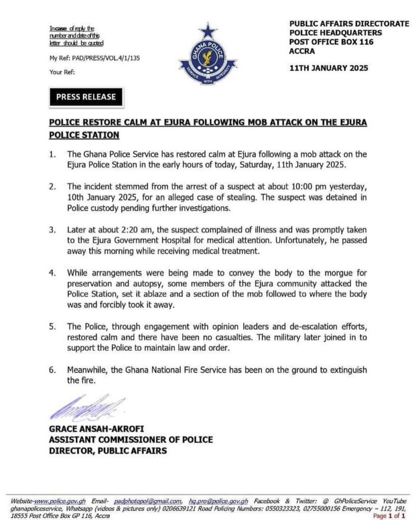 The Ghana Police Service has confirmed that calm has been restored in Ejura following a mob attack on the Ejura Police Station. The incident, which occurred in the early hours of January 11, 2025, stemmed from the death of a suspect who had been detained for an alleged case of theft.
