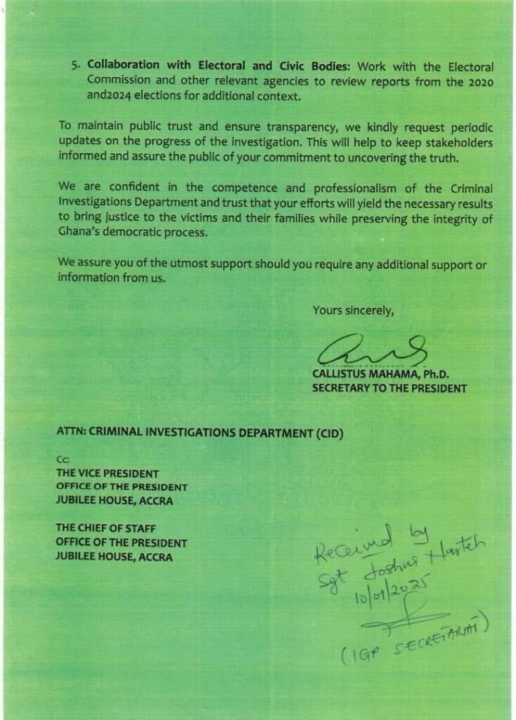 The directive, issued via an official correspondence signed by Dr. Callistus Mahama, Secretary to the President, emphasizes the importance of delivering justice to the victims and their families while safeguarding the integrity of Ghana’s democratic process.