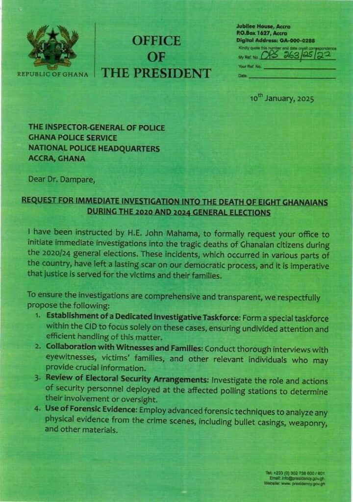 President John Mahama has directed the Ghana Police Service to investigate the deaths of eight citizens during the 2020 and 2024 elections. The directive aims to ensure justice for victims and reinforce the integrity of Ghana’s democracy.