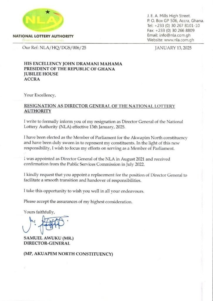 Samuel Awuku, the Director-General of the National Lottery Authority (NLA), has officially resigned from his position, effective January 13, 2025. In a formal letter addressed to President John Dramani Mahama, Mr. Awuku cited his recent election and swearing-in as the Member of Parliament (MP) for Akuapem North Constituency as the reason for his resignation, stating his intention to fully dedicate himself to serving his constituents.